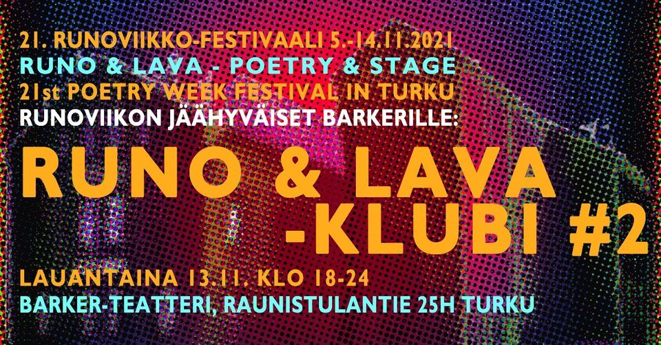 Runo & lava -klubin toinen puoliaika lauantaina 13.11.2021 klo 18-24 Barker-teatterissa