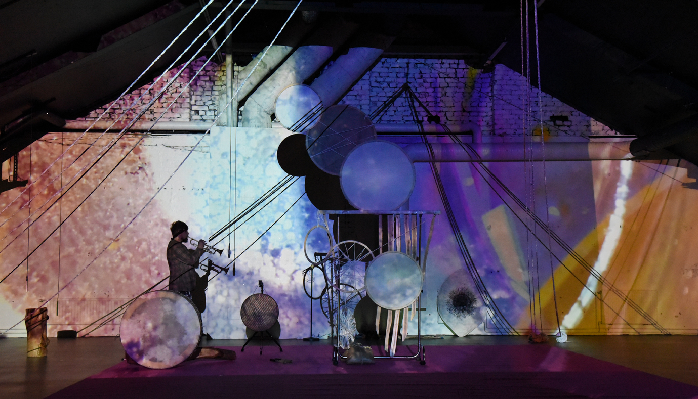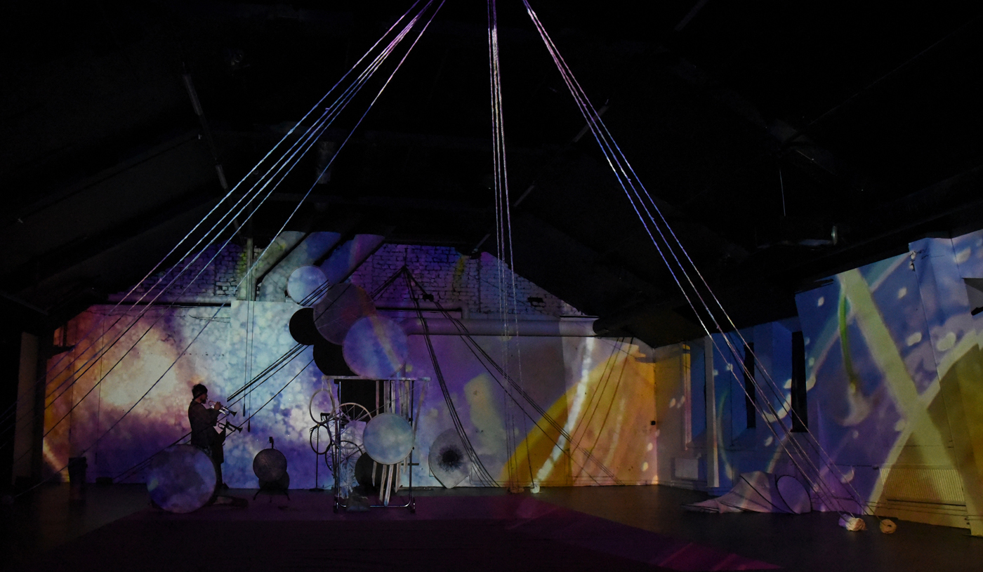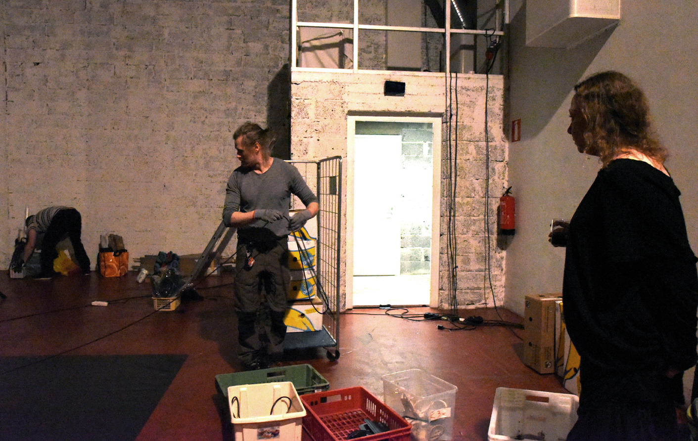 I created this solo in different studios; in Amsterdam, in Turku and in my living room. I have used several objects and tools to help me, but have thrown everything away, and what remains is me and behind me a projection of graphic work from the same band.